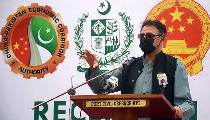 وزیر فدرال برنامه ریزی ، توسعه و ابتکارات ویژه اسد عمر در حال سخنرانی در مراسمی از اولین محموله کارخانه و ماشین آلات در KPT برای Century Steel برای راه اندازی کارخانه تولید فولاد تحت CPEC در راشاکای SEZ. -APP